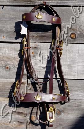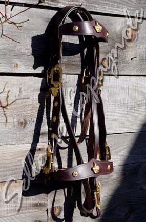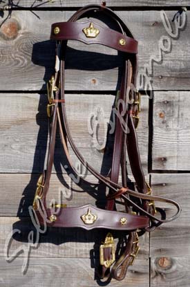 Havane décos OR couronne sur muserolle et frontal , Grandes boucles carrées travaillées. |